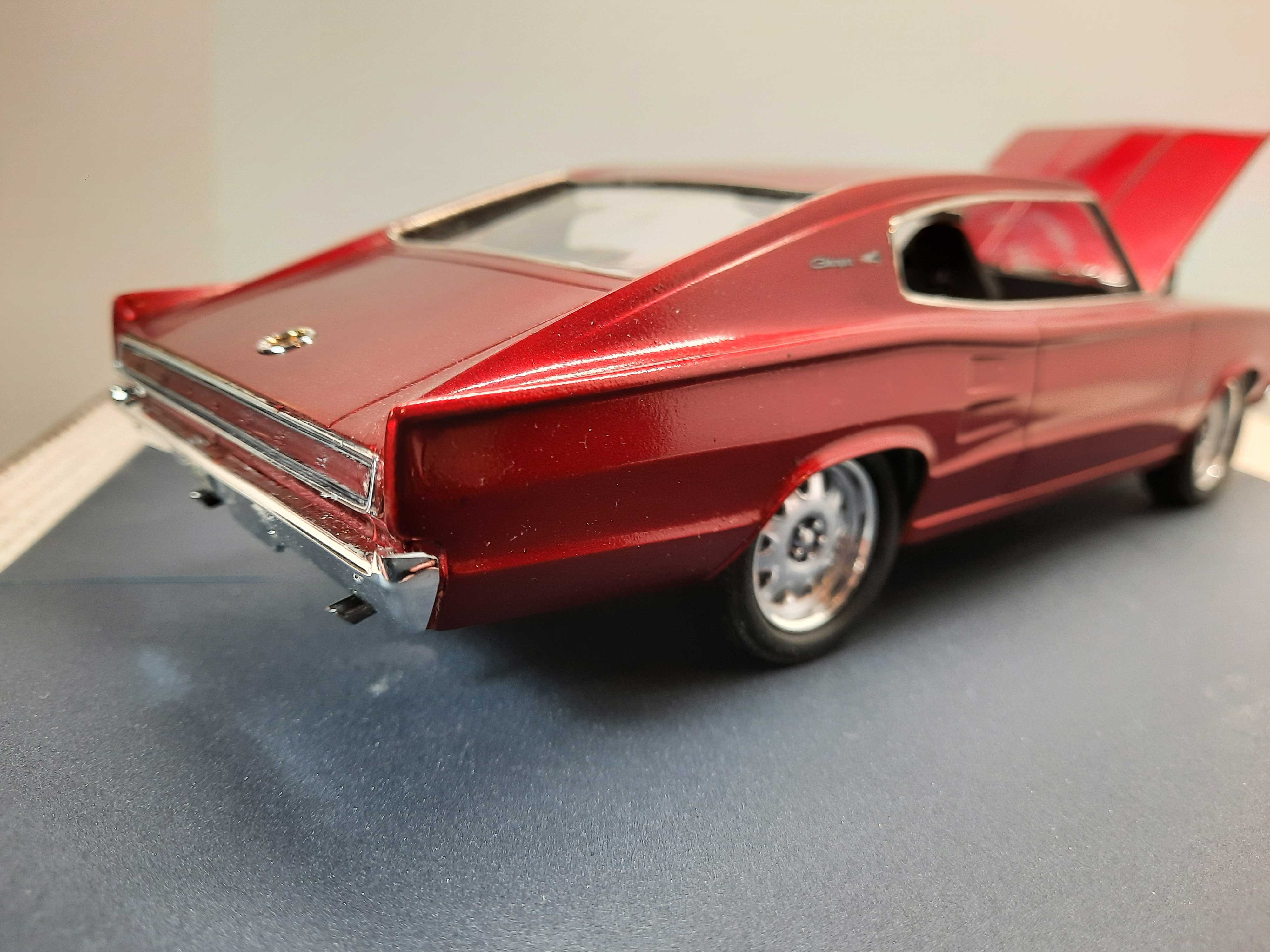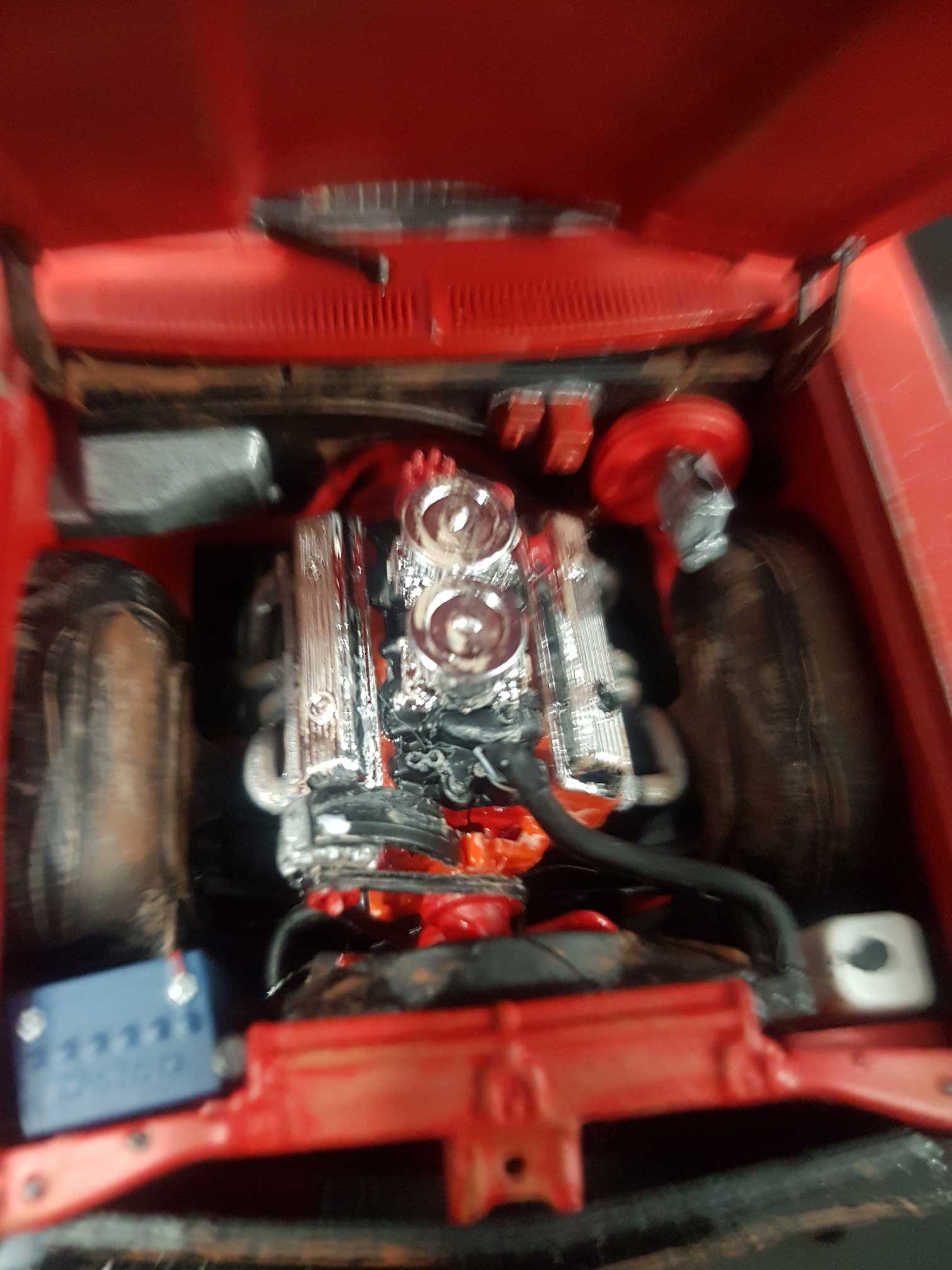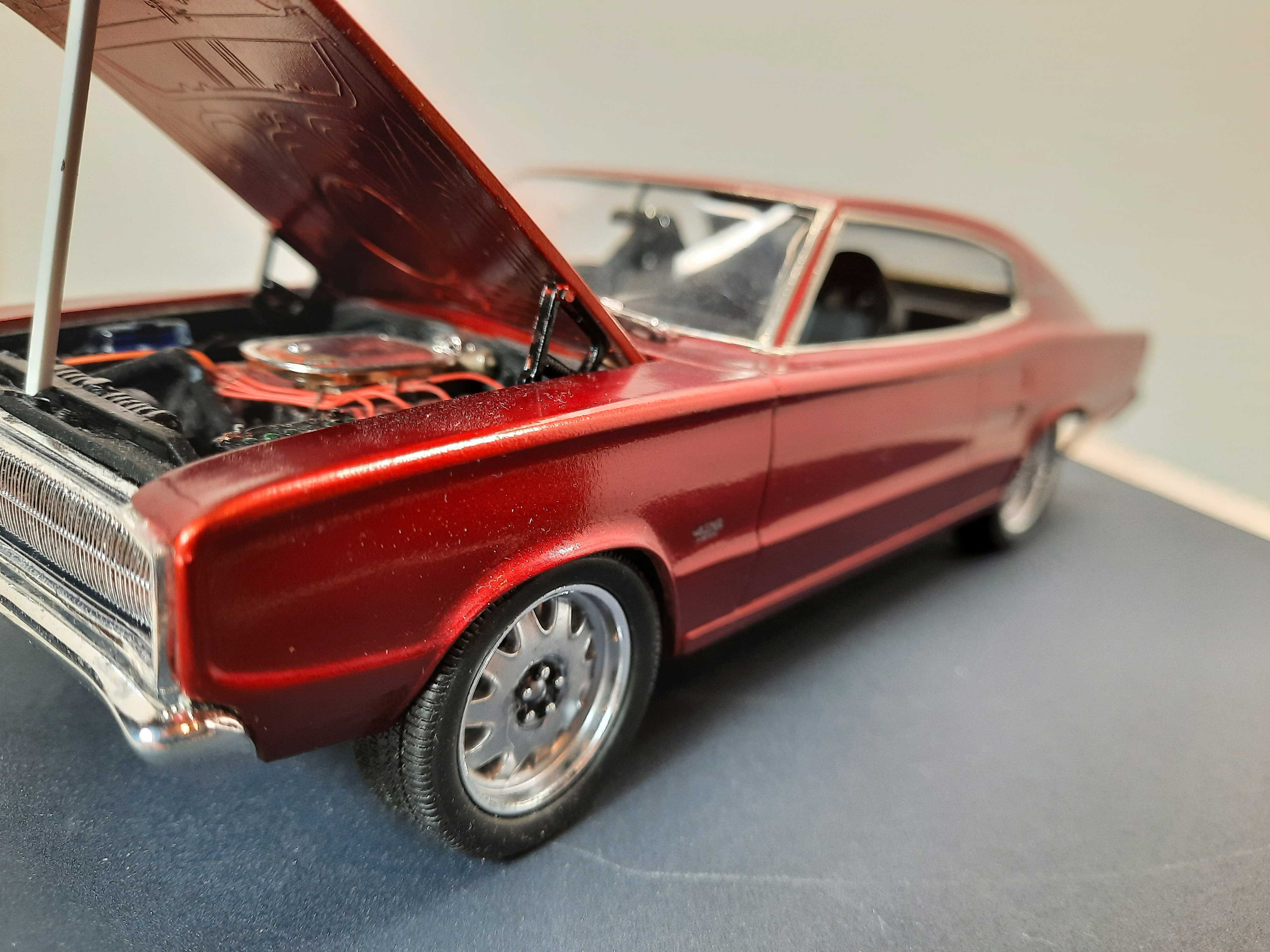 Paint:body:Krylon clear red metal over gold and silver base, misc shades of Alclads through out the chassis. Interior upgrades:black with red inserts, PE Hurst shifter, paint detailed. Engine upgrades: wired and plumber Hemi, engine