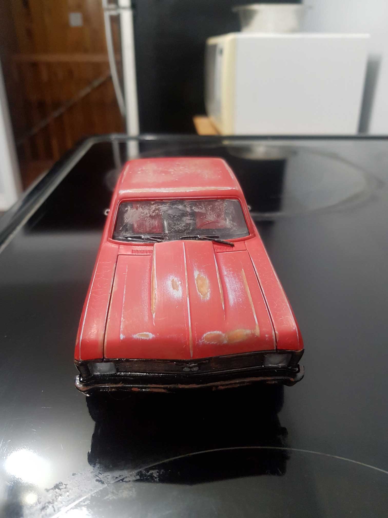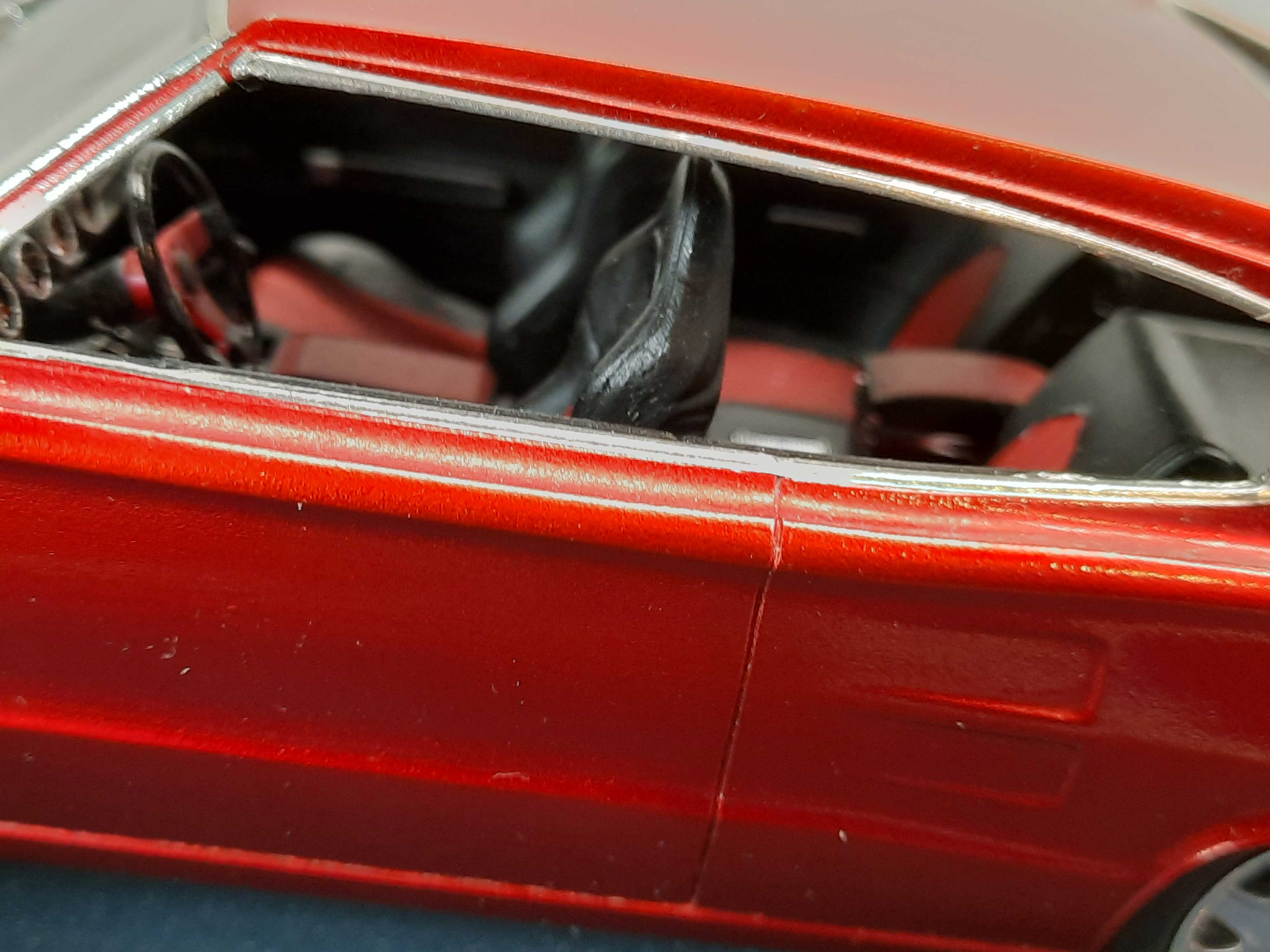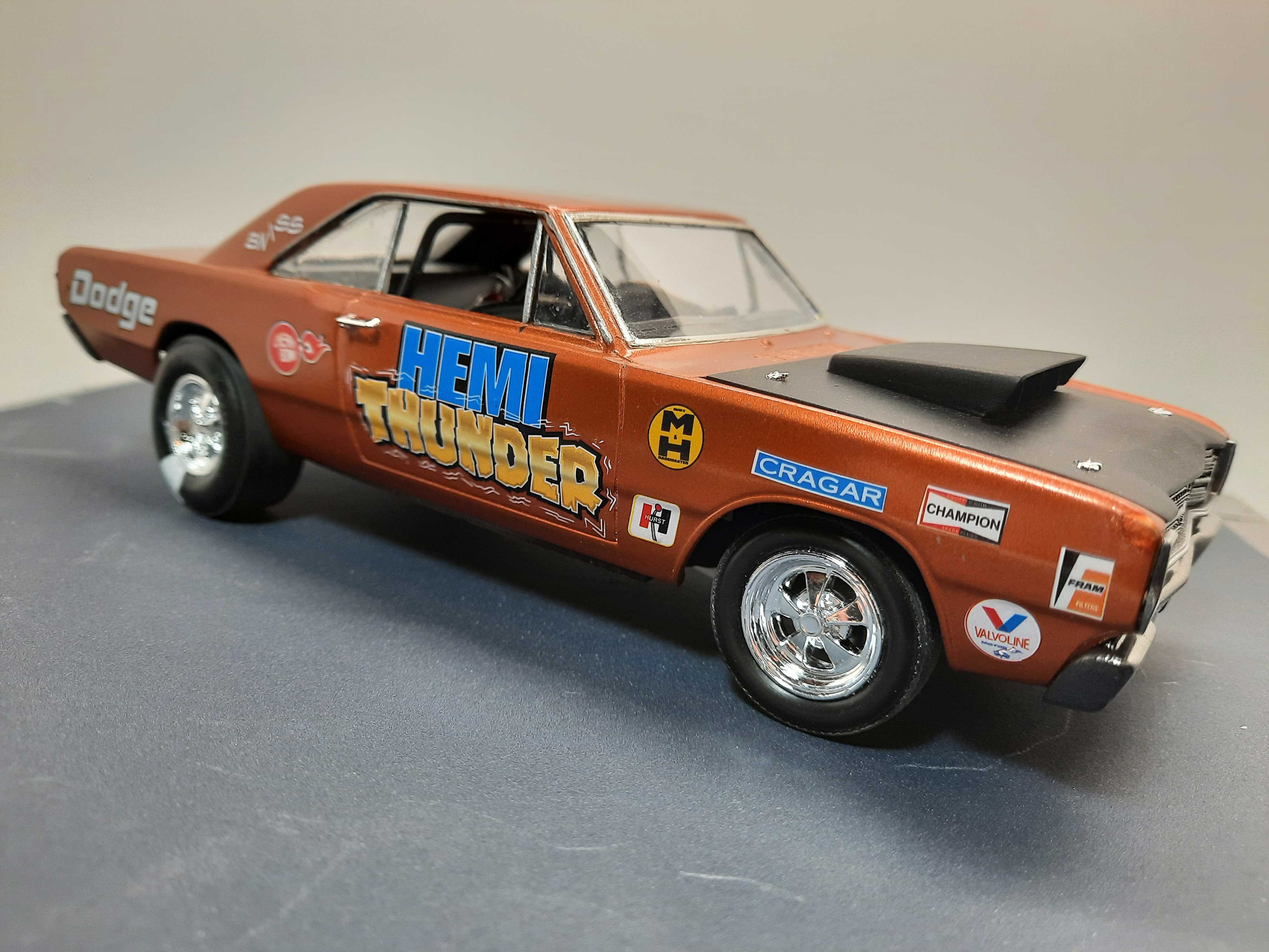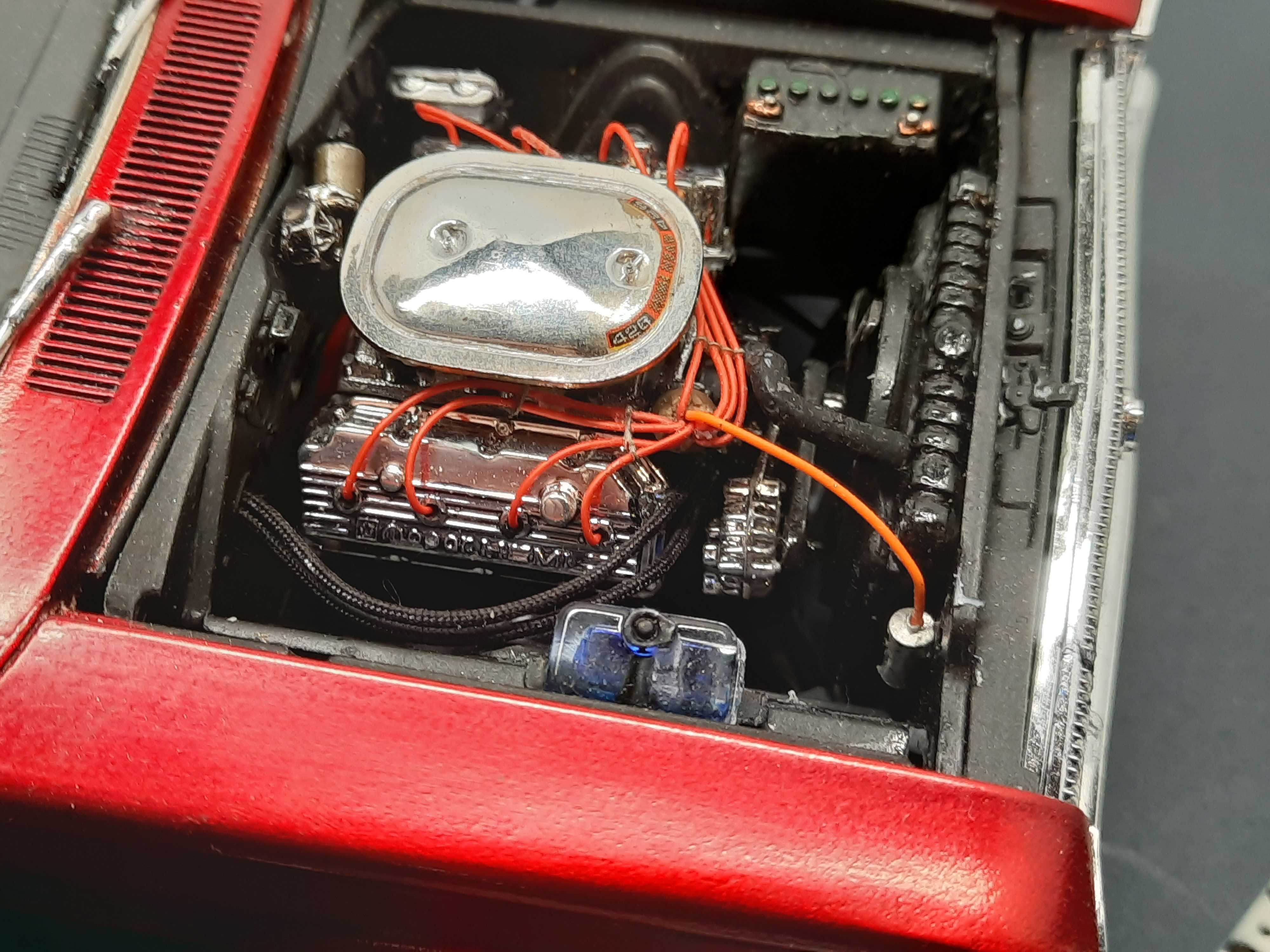 Paint:body:Krylon clear red metal over gold and silver base, misc shades of Alclads through out the chassis. Interior upgrades:black with red inserts, PE Hurst shifter, paint detailed. Engine upgrades: wired and plumber Hemi, engine
