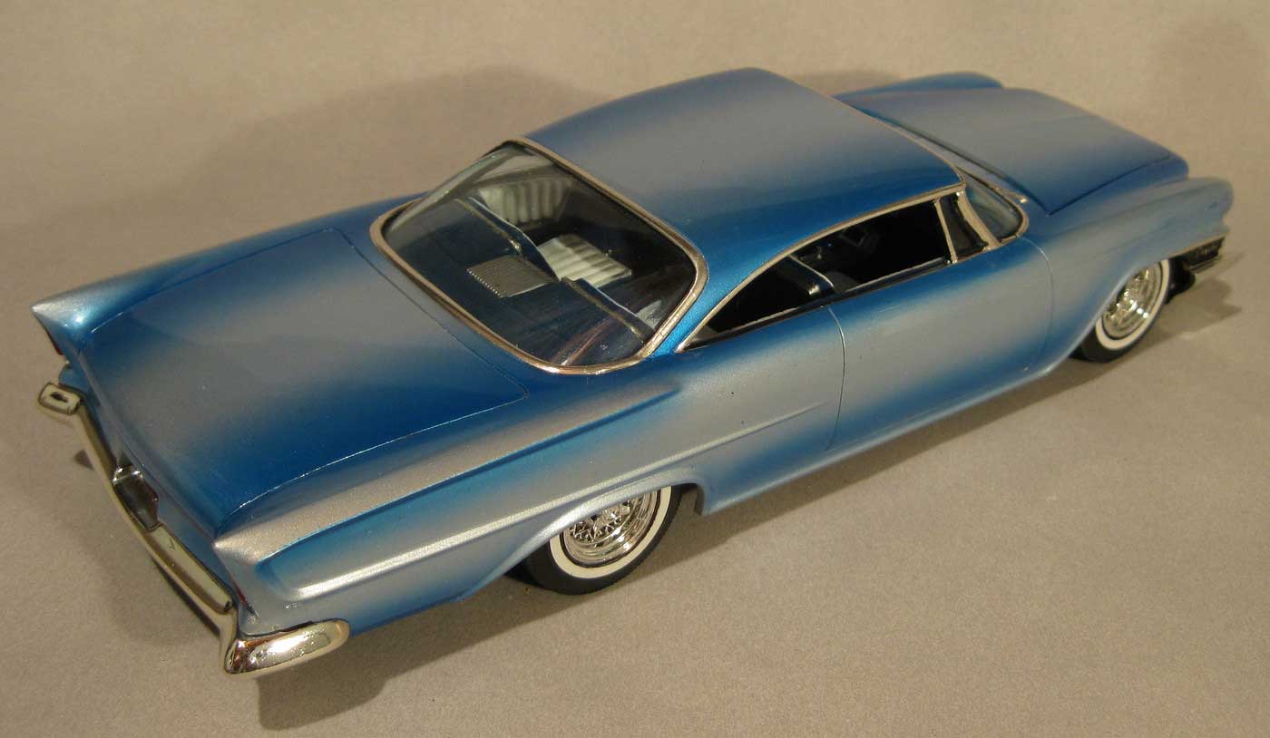 Full custom with chopped top, custom front and rear treatments done from scratch with scratch made grille and tail lights. Trim shaved, hood pancaked. Front and rear fenders extended. Custom blended, fogged lacquer in shades of blue. Interior cut apart and seat inserts and door panels modified with strip styrene. Shallow interior tub floor cut off and interior deepened. Kit engine modified with cross ram intake, plug wires, heater/rad hoses and throttle linkage.