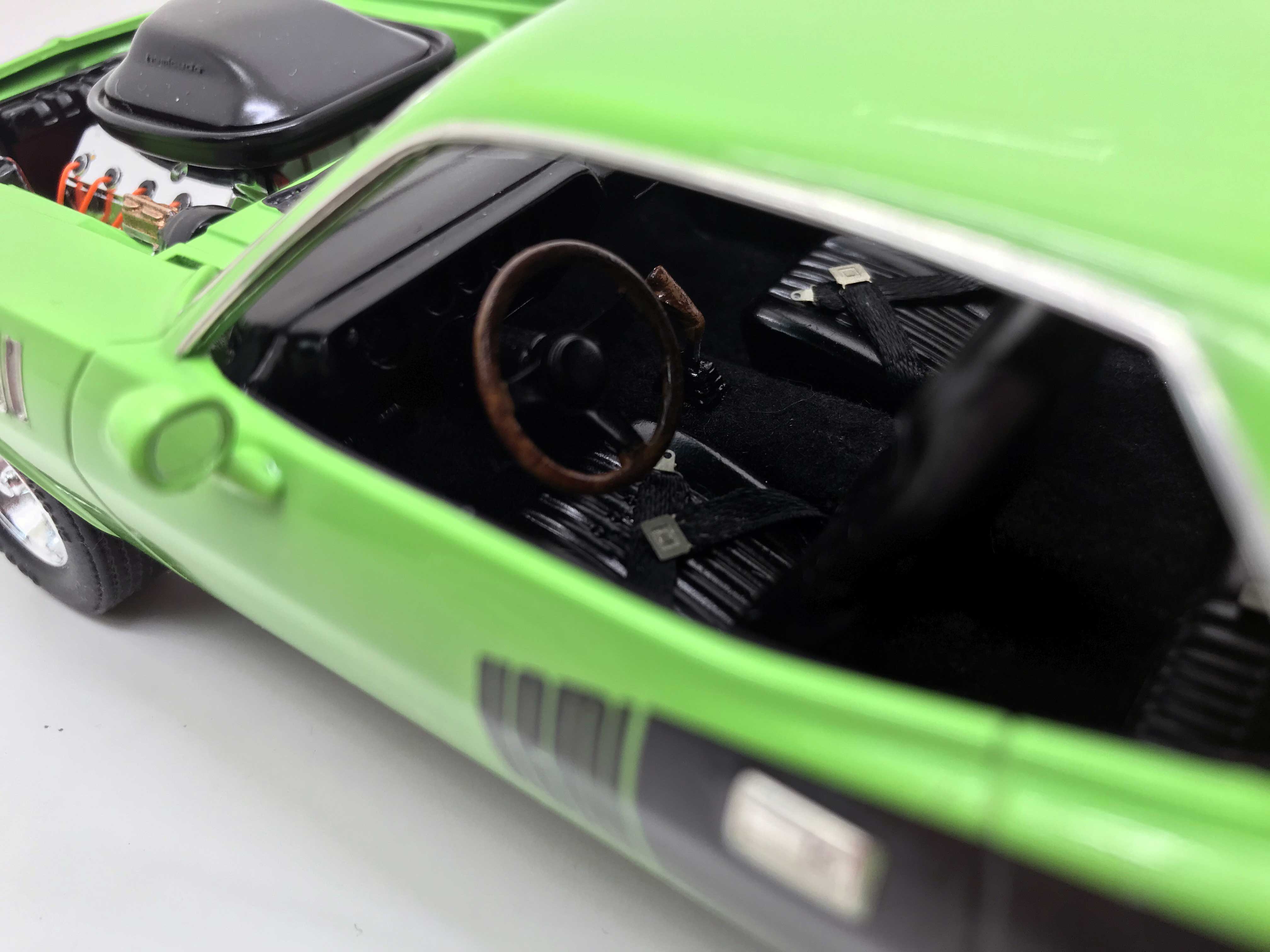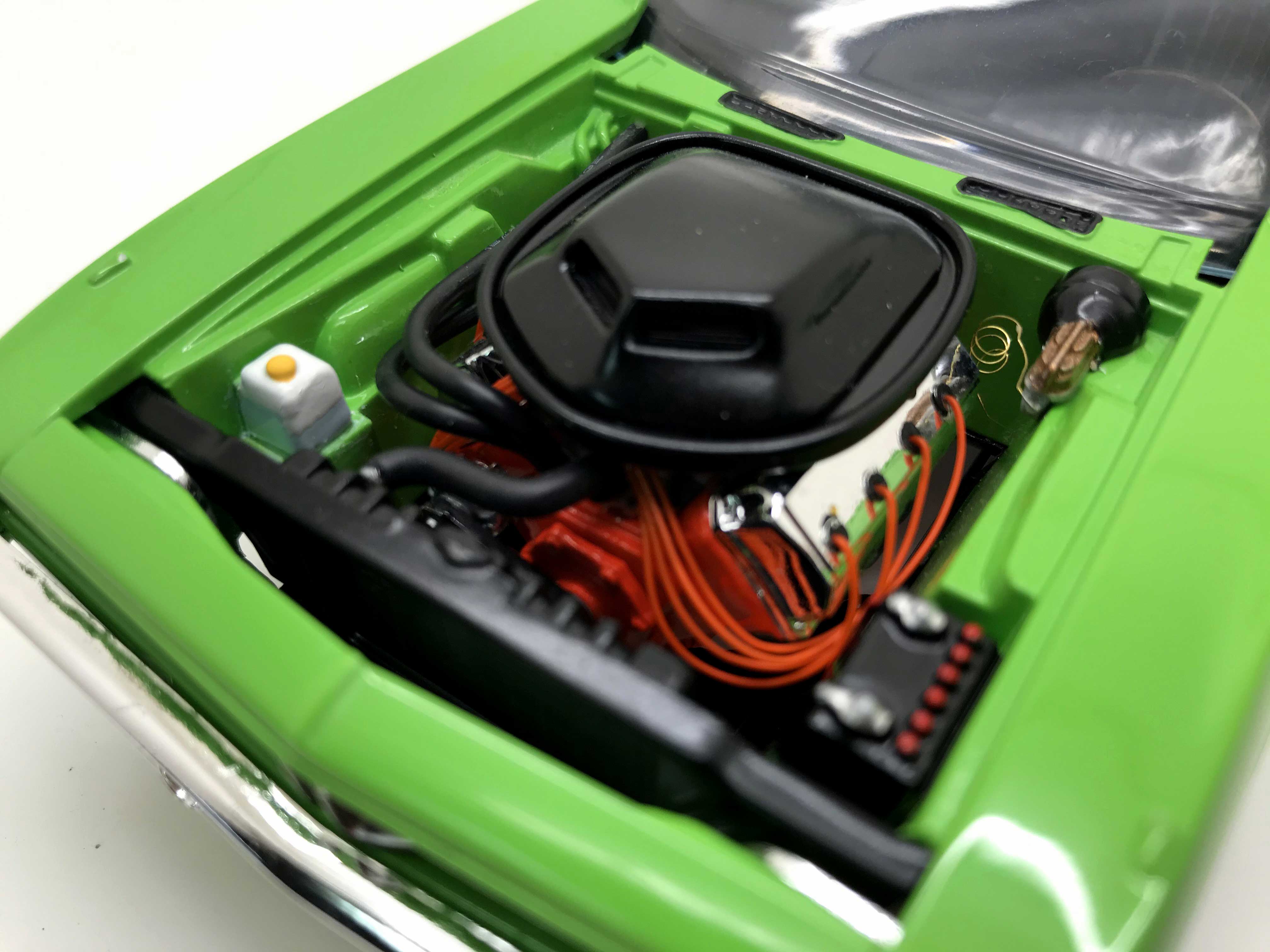 In 1:24 scale. This classic Mopar was painted in Model Master Sublime Green and clear coated in Testors Wet Look. The finish was then leveled and polished out with Micro-Mesh pads. The engine bay is fully wired and plumbed, including heater hoses and brake lines. It rides on upgraded Firestone tires from MRC. The detailed interior includes seat belts and hand painted wood grain steering wheel and shifter handle.