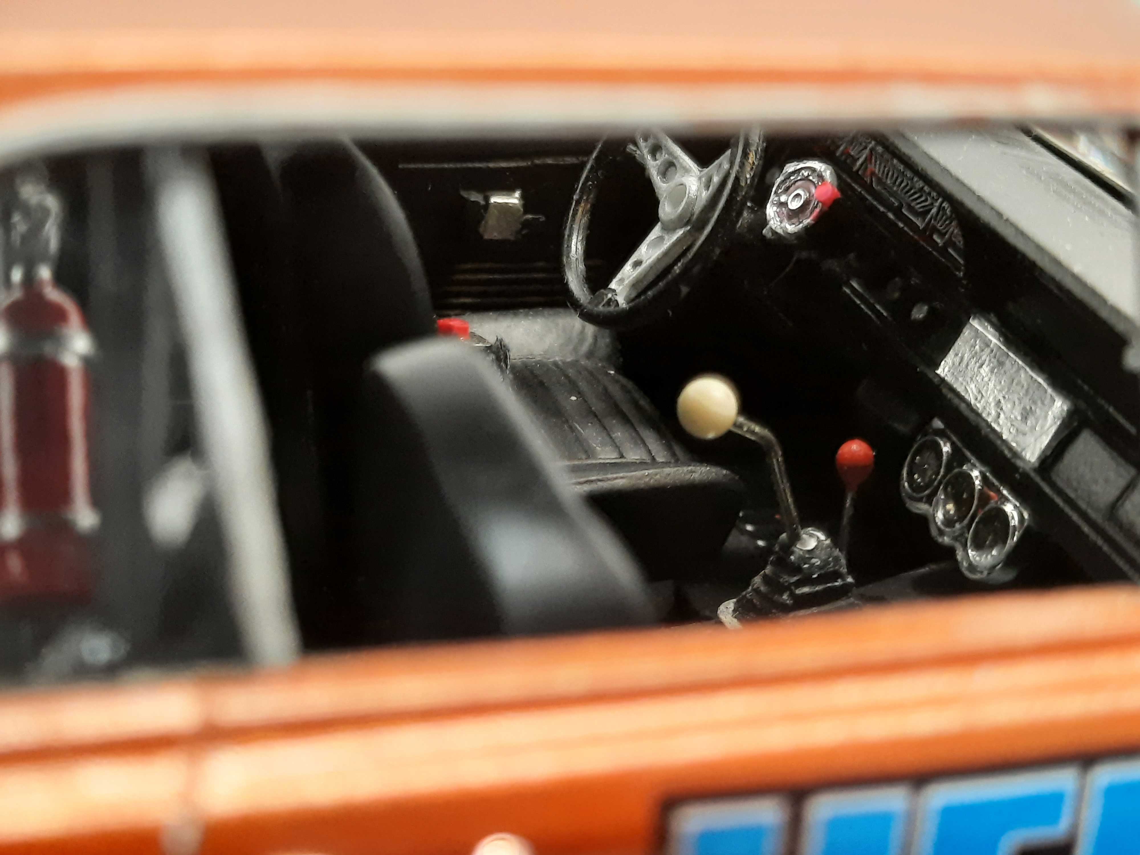 Color:Tamiya Metallic Orange w/semi-gloss black and various Alclads for detail. Engine Upgrades: wired and plumbed Hemi, with tach. Drive, screened intake horns, paint details Interior upgrades: replaced seats w/seats from A-100 pick up, reverse lockout, scratch built tach and shift light, seat belts, window pulls, dash plates. Exterior Upgrades: stripped bumpers and grill and refinished in Alclad aluminums