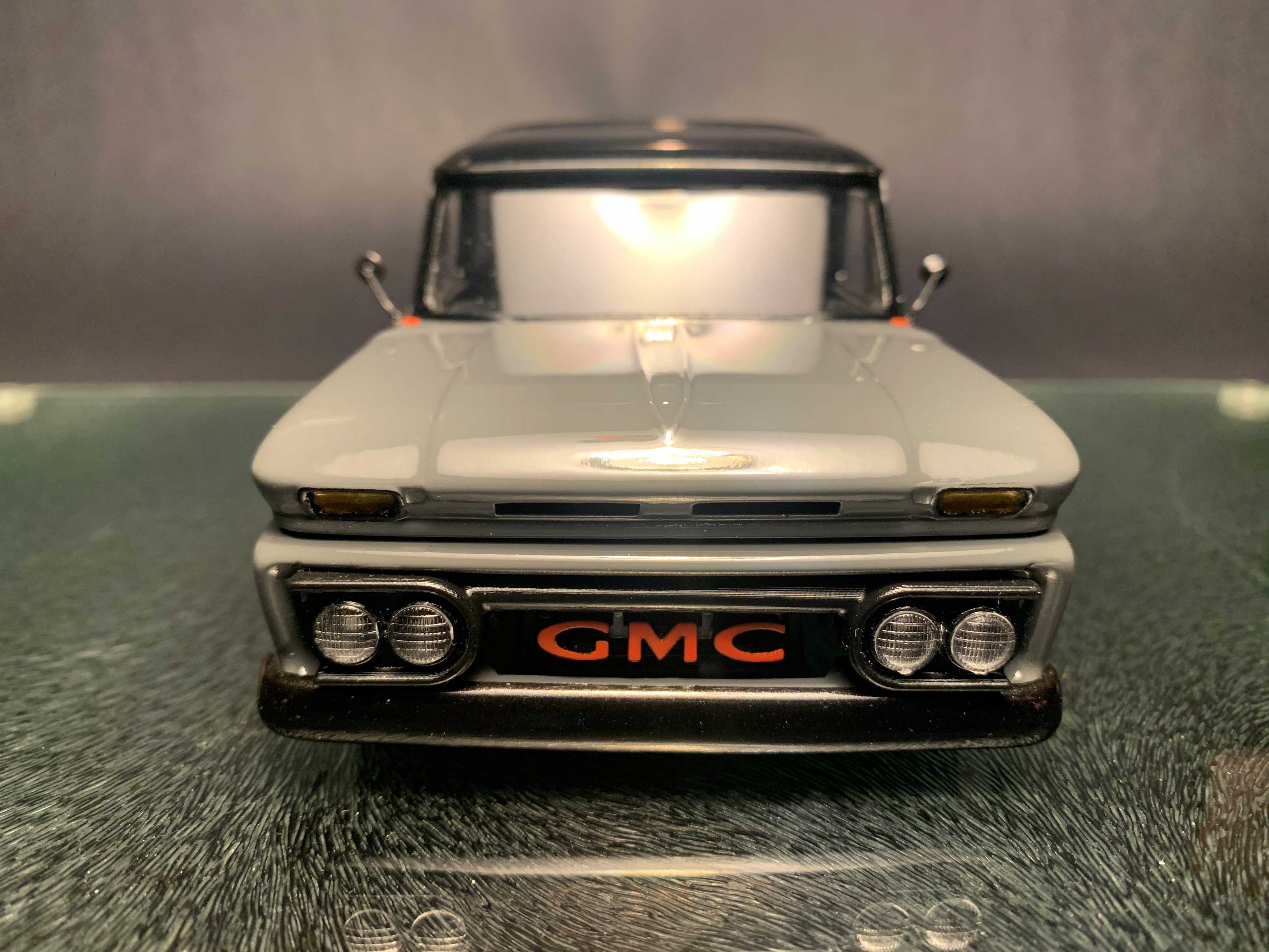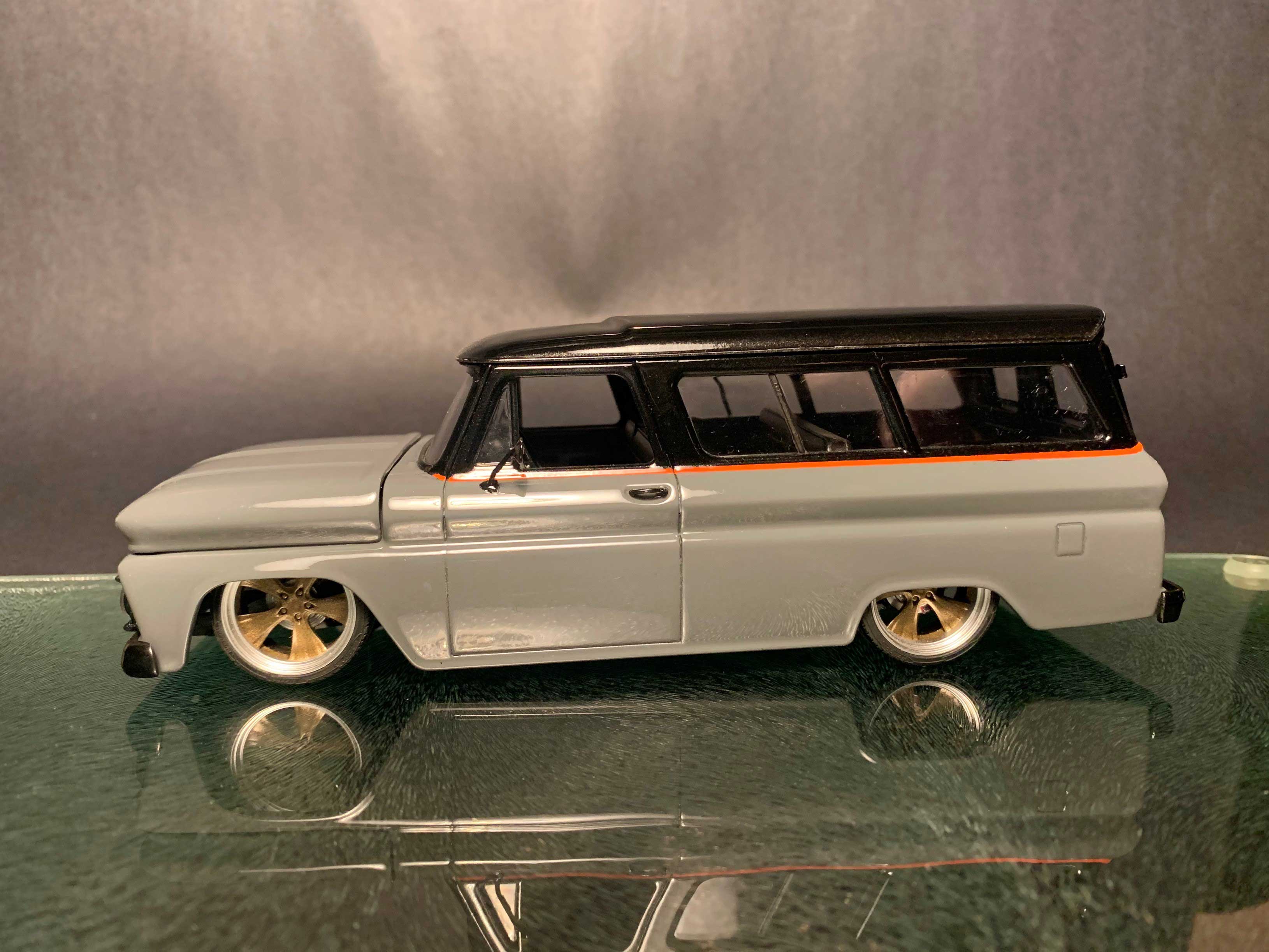 It’s been painted with Duplicolor paints, and some Krylon clear. I combined two sets of Aoshima wheels to get the wheel selection I had added. It’s been heavily lowered with full custom under hood metal work done using a spare hood I had. The rear suspension sports NASCAR hardware, along with tubs from a Nascar Thunderbird kit. The engine is a fuel injected small block, dressed in way to accent the outside color of the truck. The kit was purchased from Scott, as were all of the details such as flocking for the carpet and brush paints for detail. I printed the GMC grill in my truck.